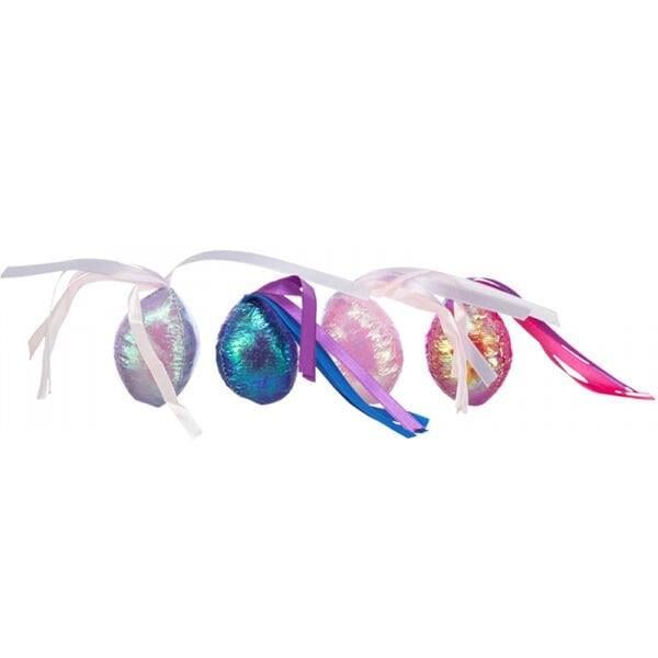 Ucları kurdelalı, parlak kumaştan üretilmiş kedi oyun toplarıdır.